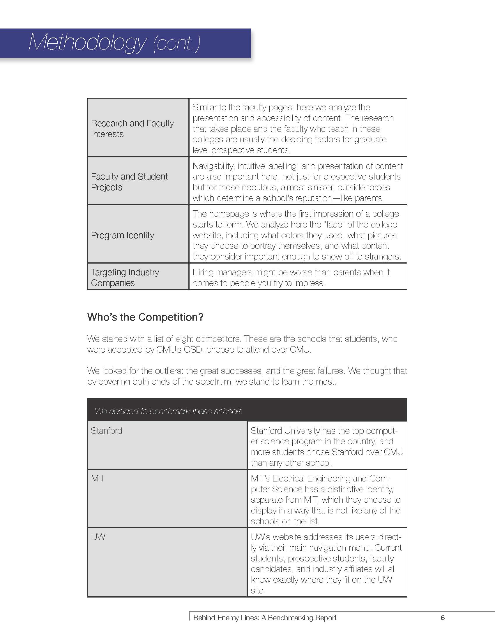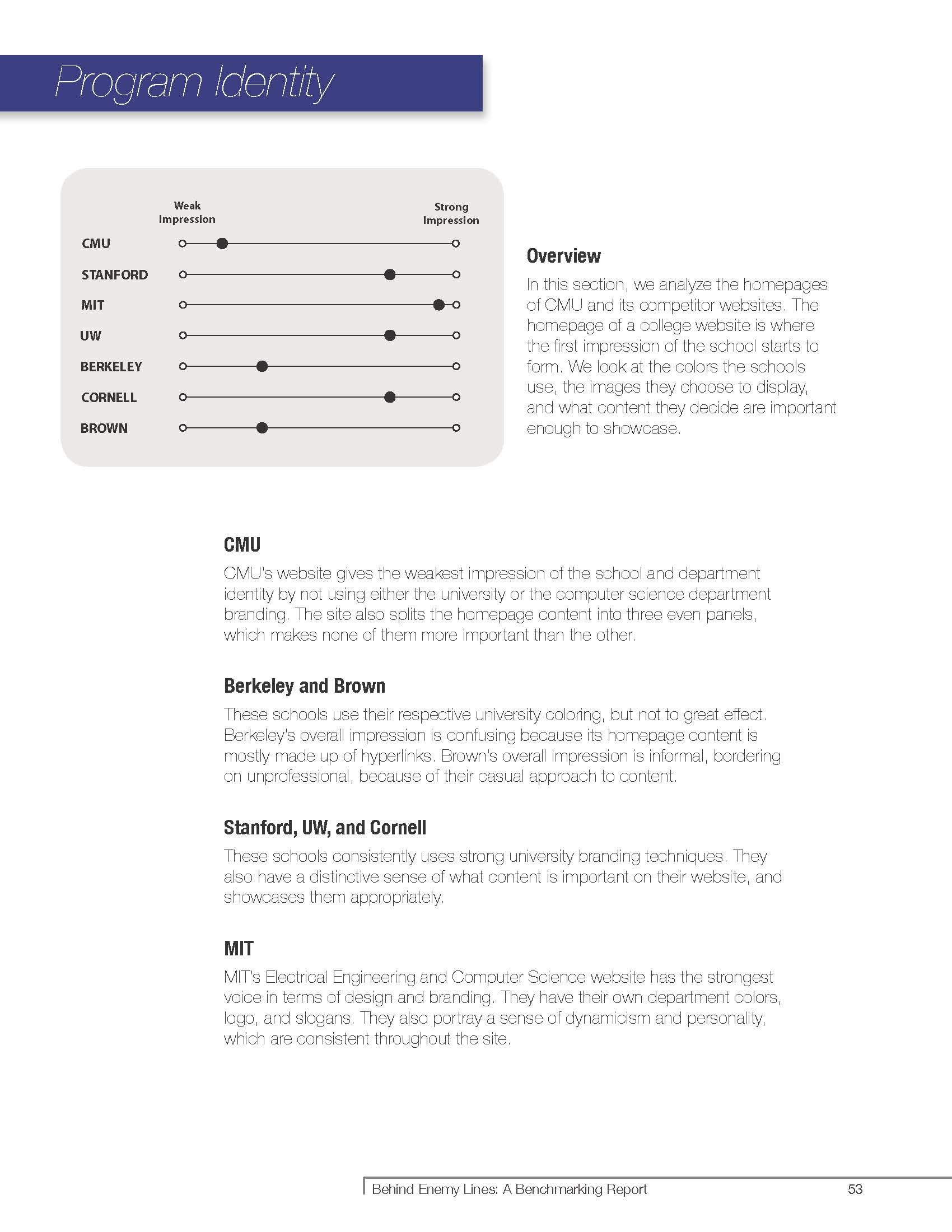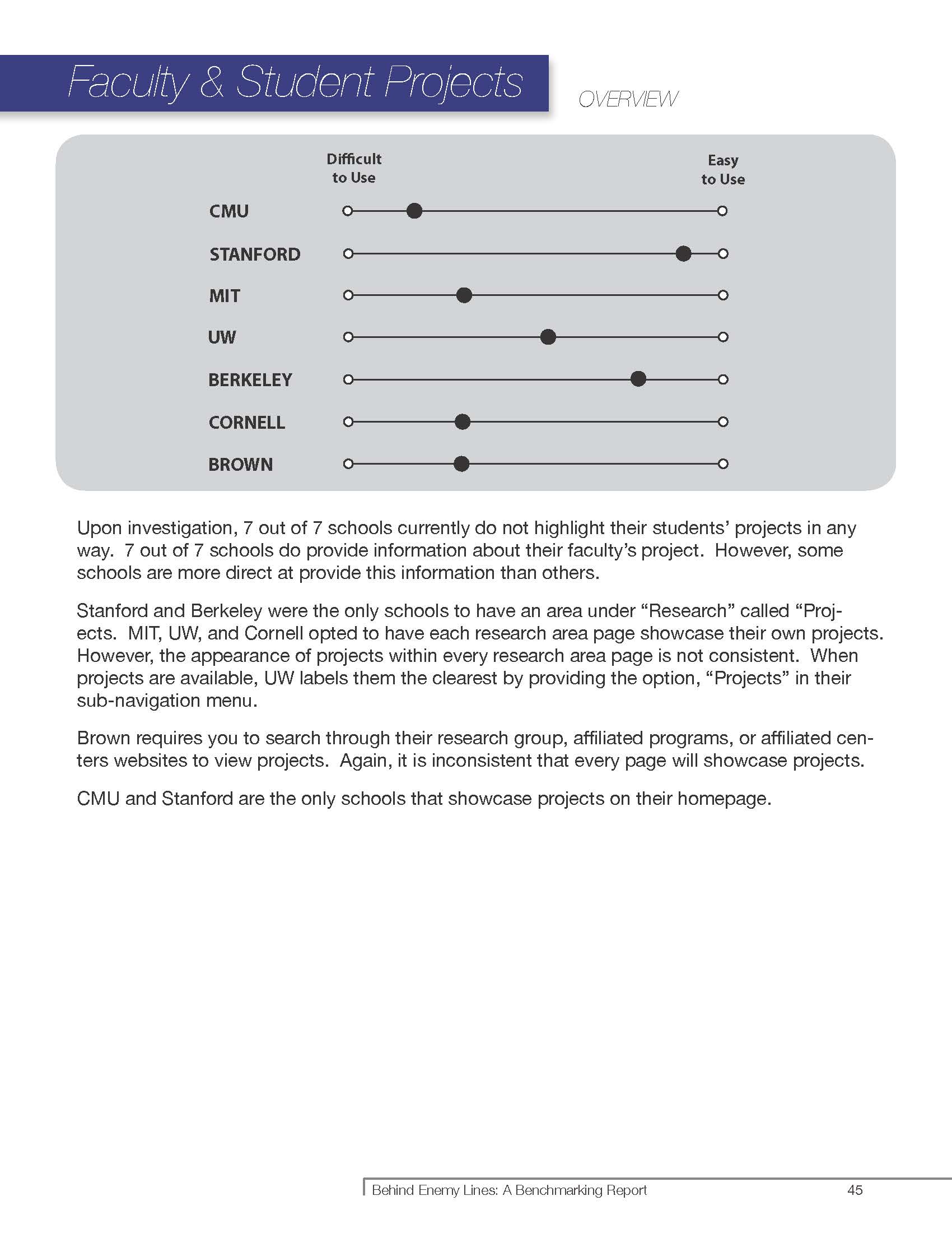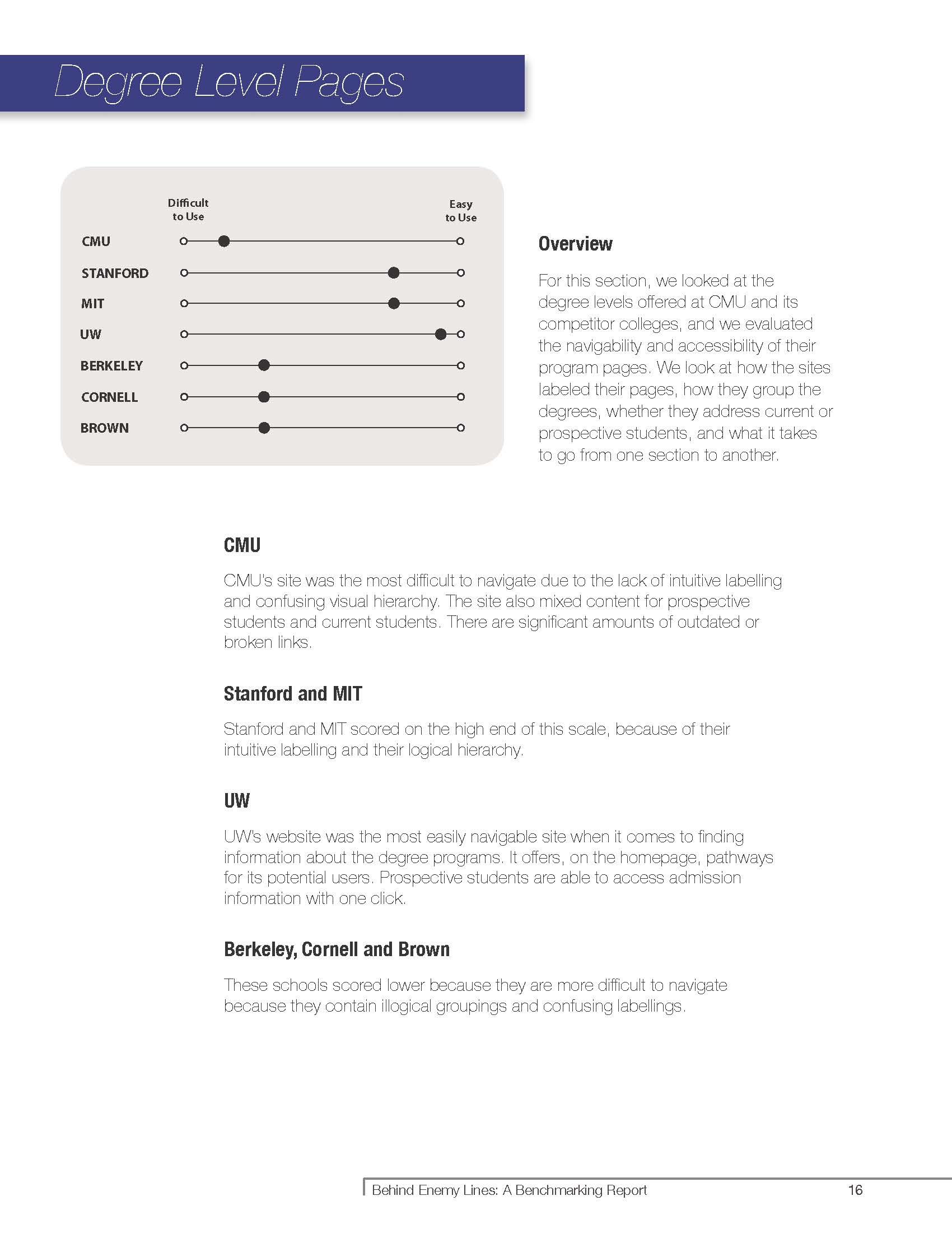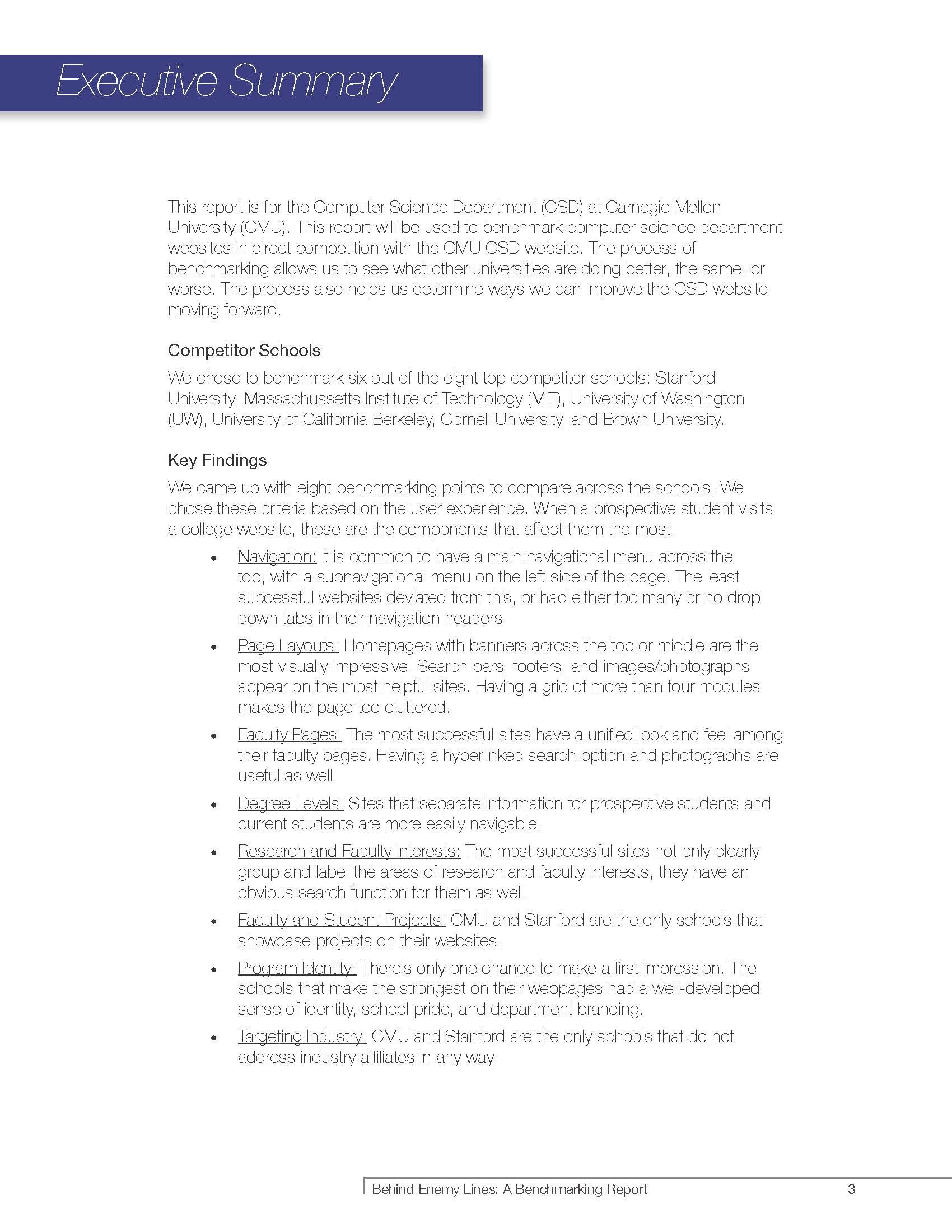 Conducted a competitive analysis of other computer science program websites. In the analysis, we reviewed the following benchmarks: navigation, page layouts, faculty pages, degree level pages, research and faculty interests, faculty and student projects, program identity, and targeting industry companies. Below is the benchmarking report summarizing our methodology and findings.