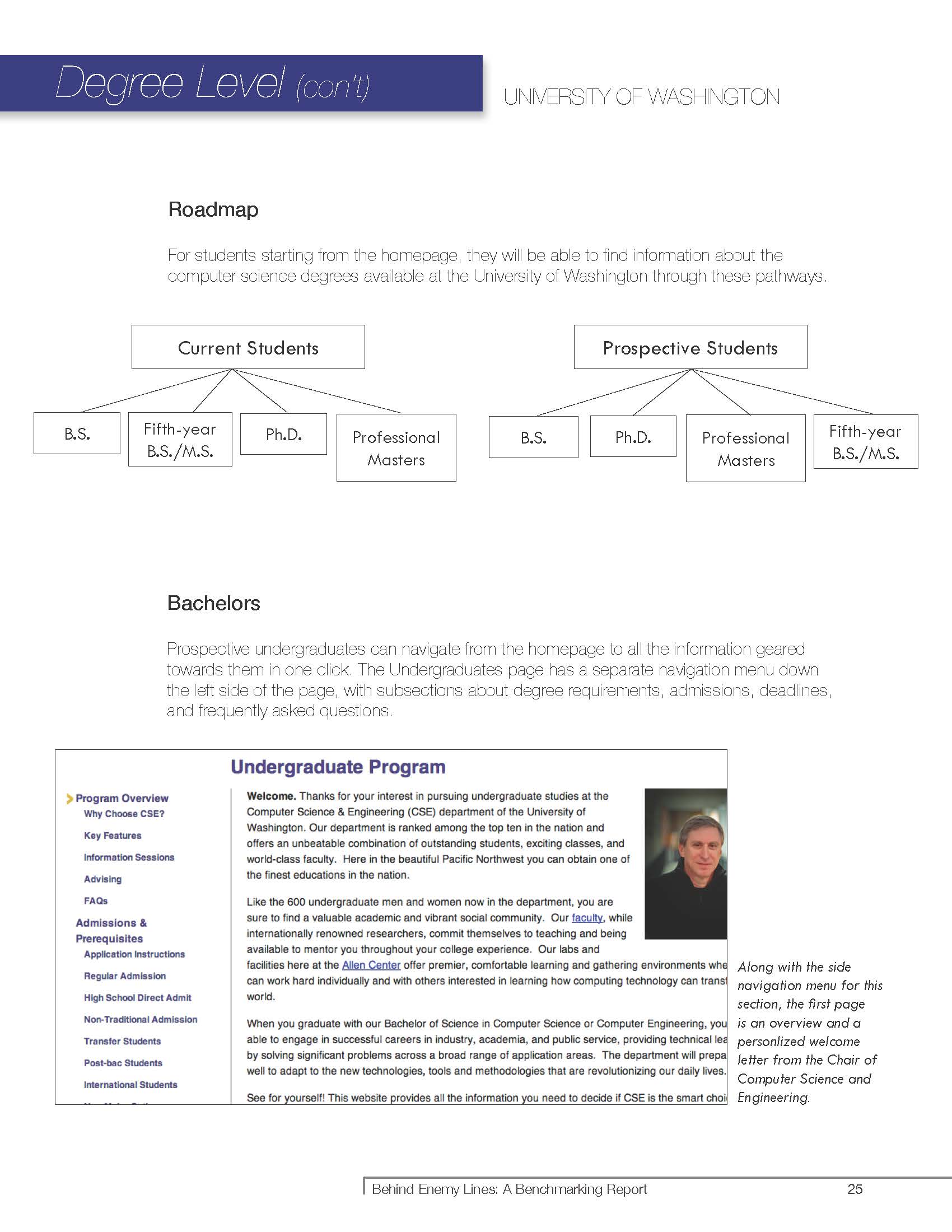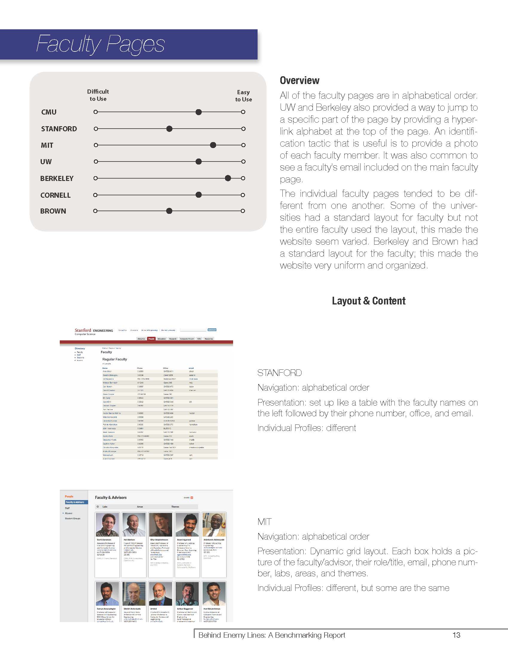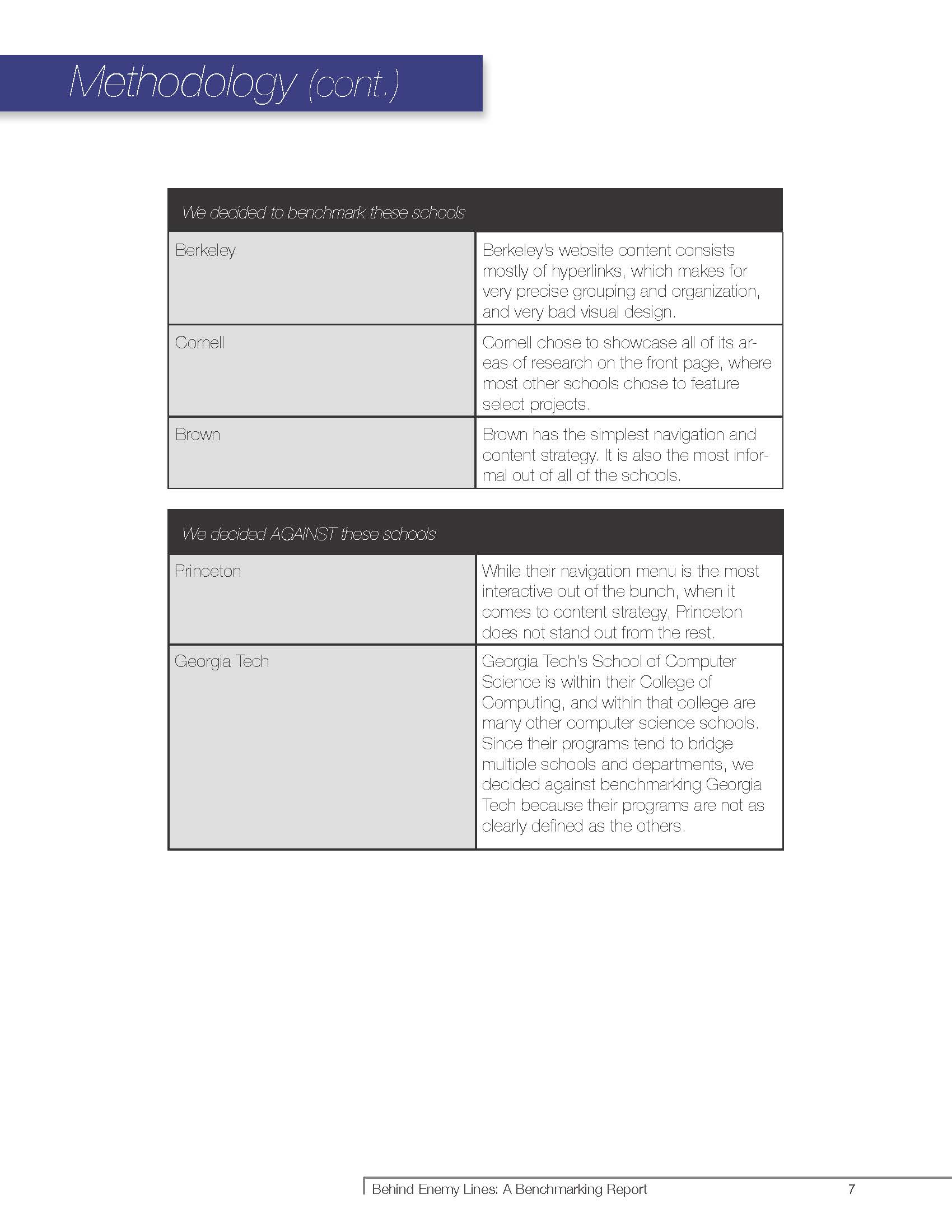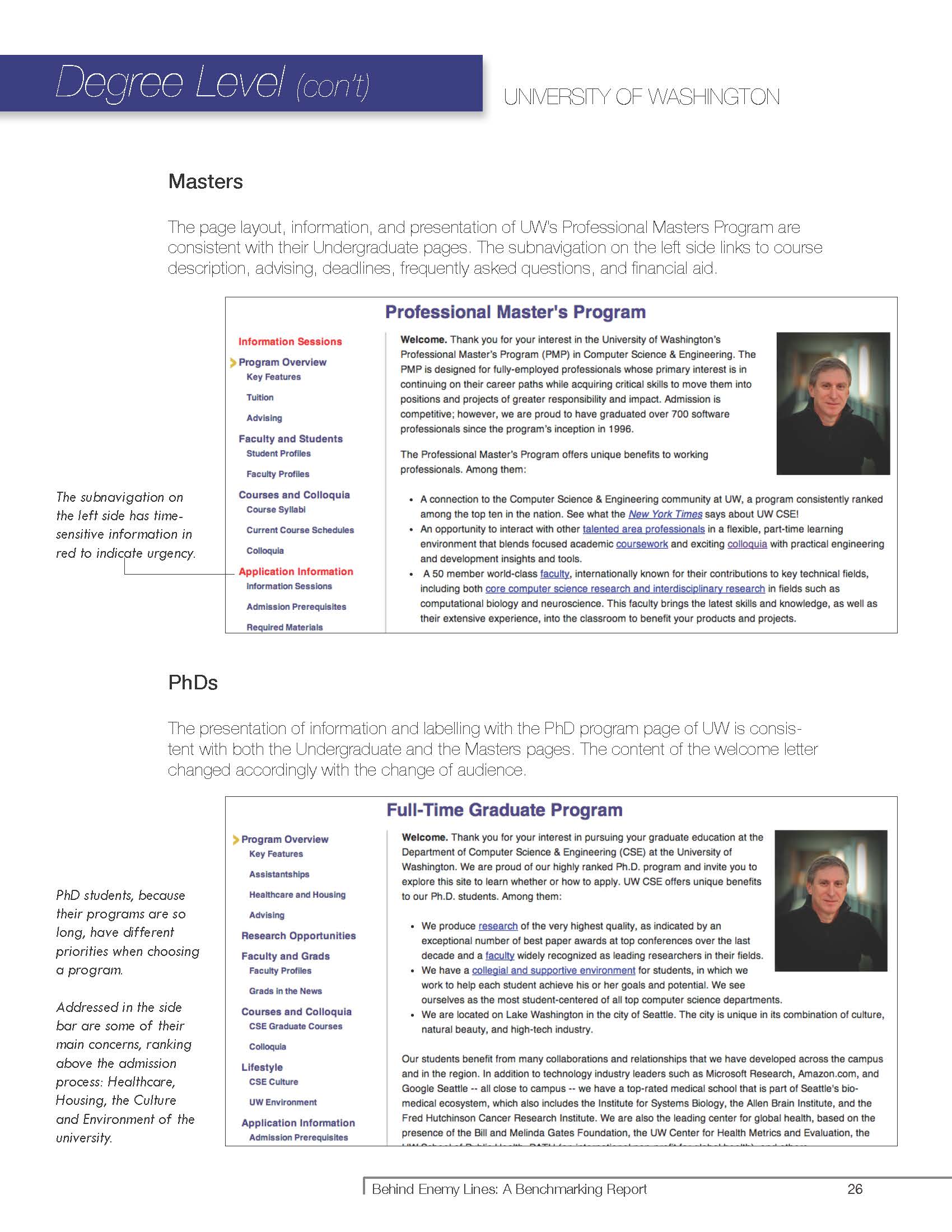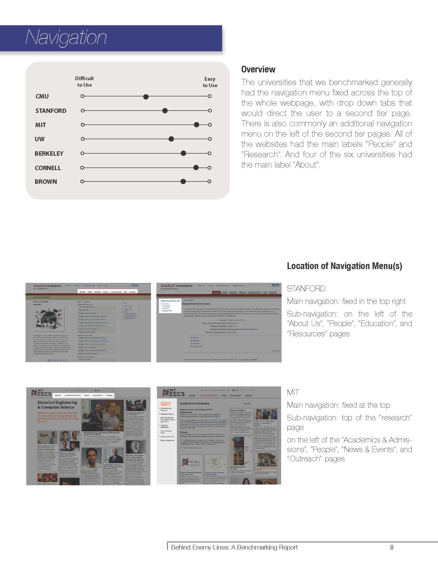 Conducted a competitive analysis of other computer science program websites. In the analysis, we reviewed the following benchmarks: navigation, page layouts, faculty pages, degree level pages, research and faculty interests, faculty and student projects, program identity, and targeting industry companies. Below is the benchmarking report summarizing our methodology and findings.