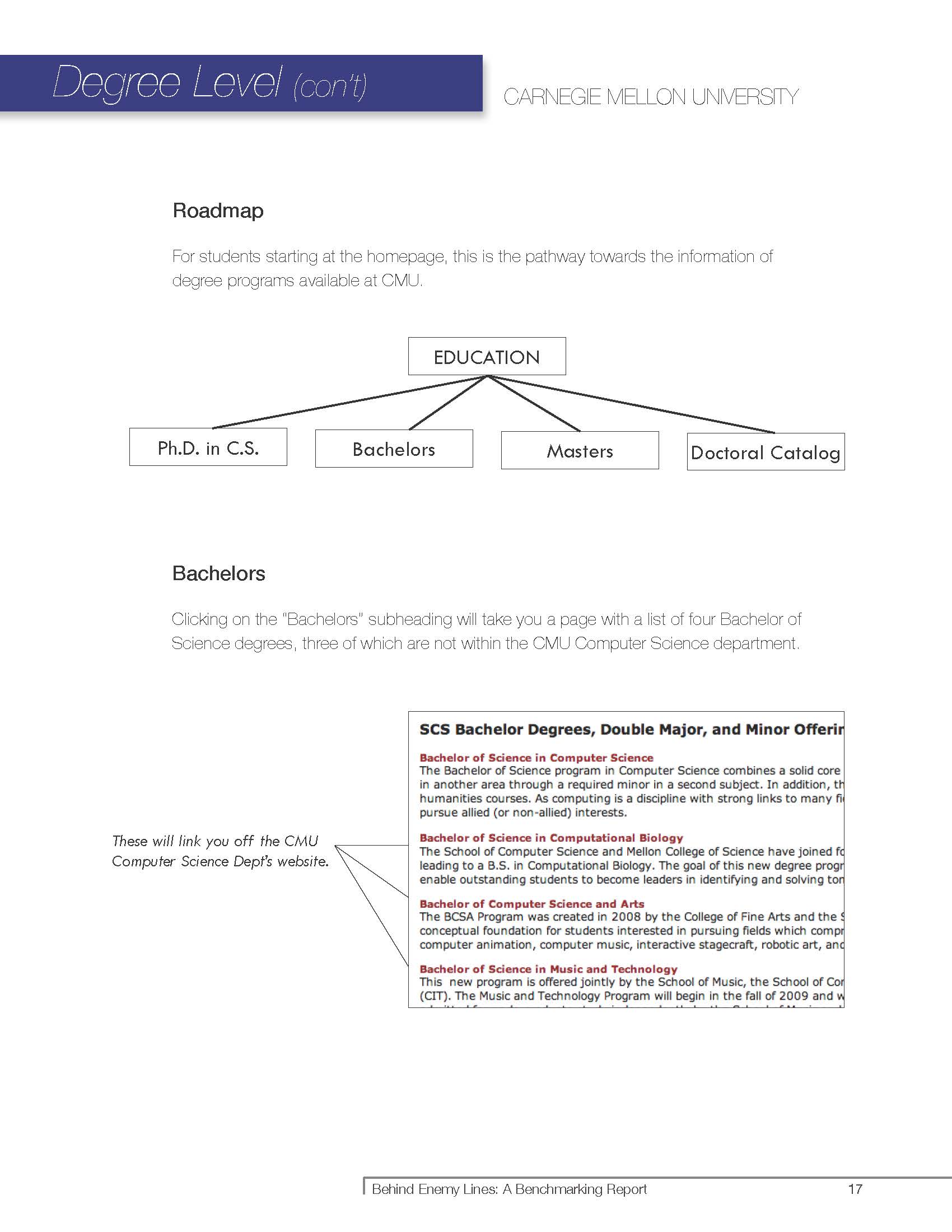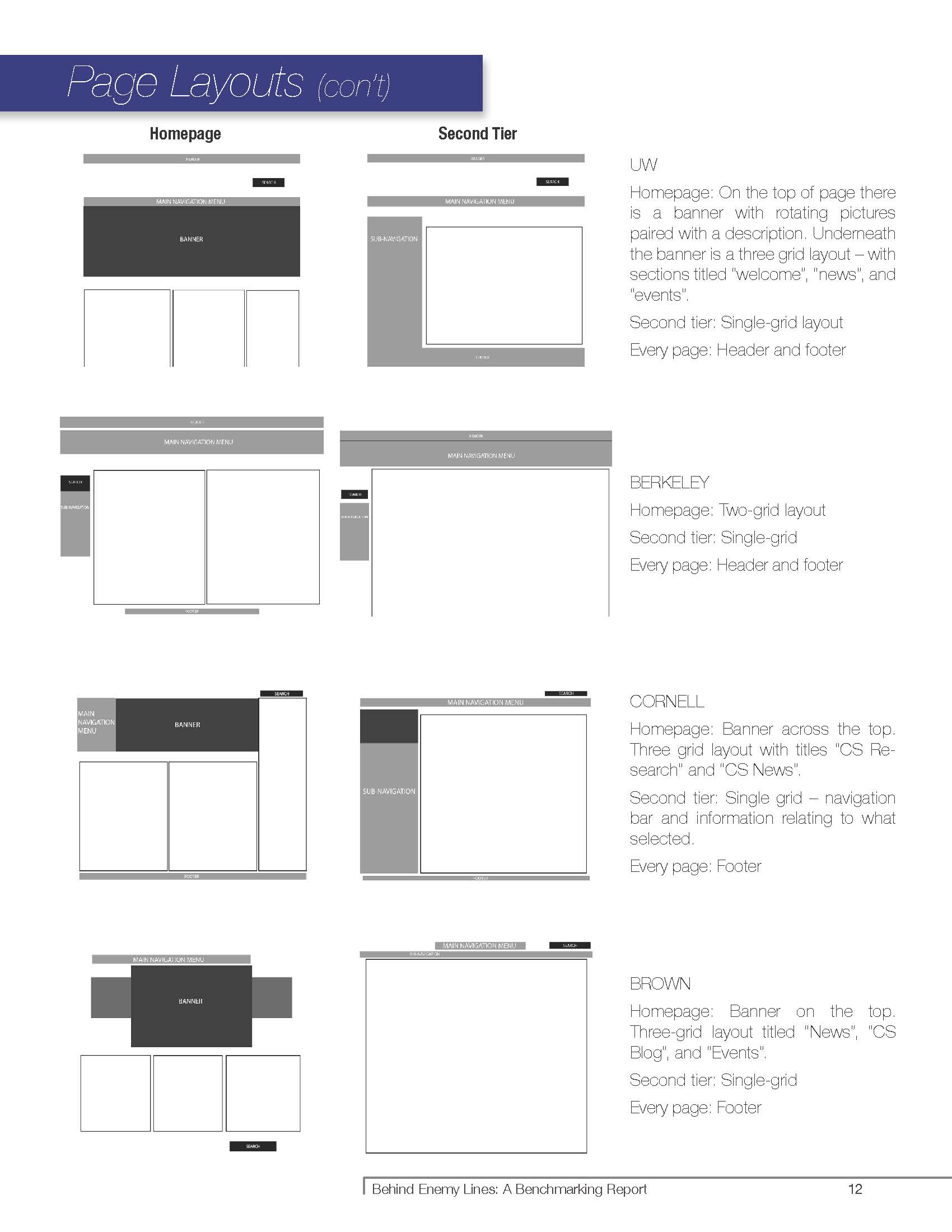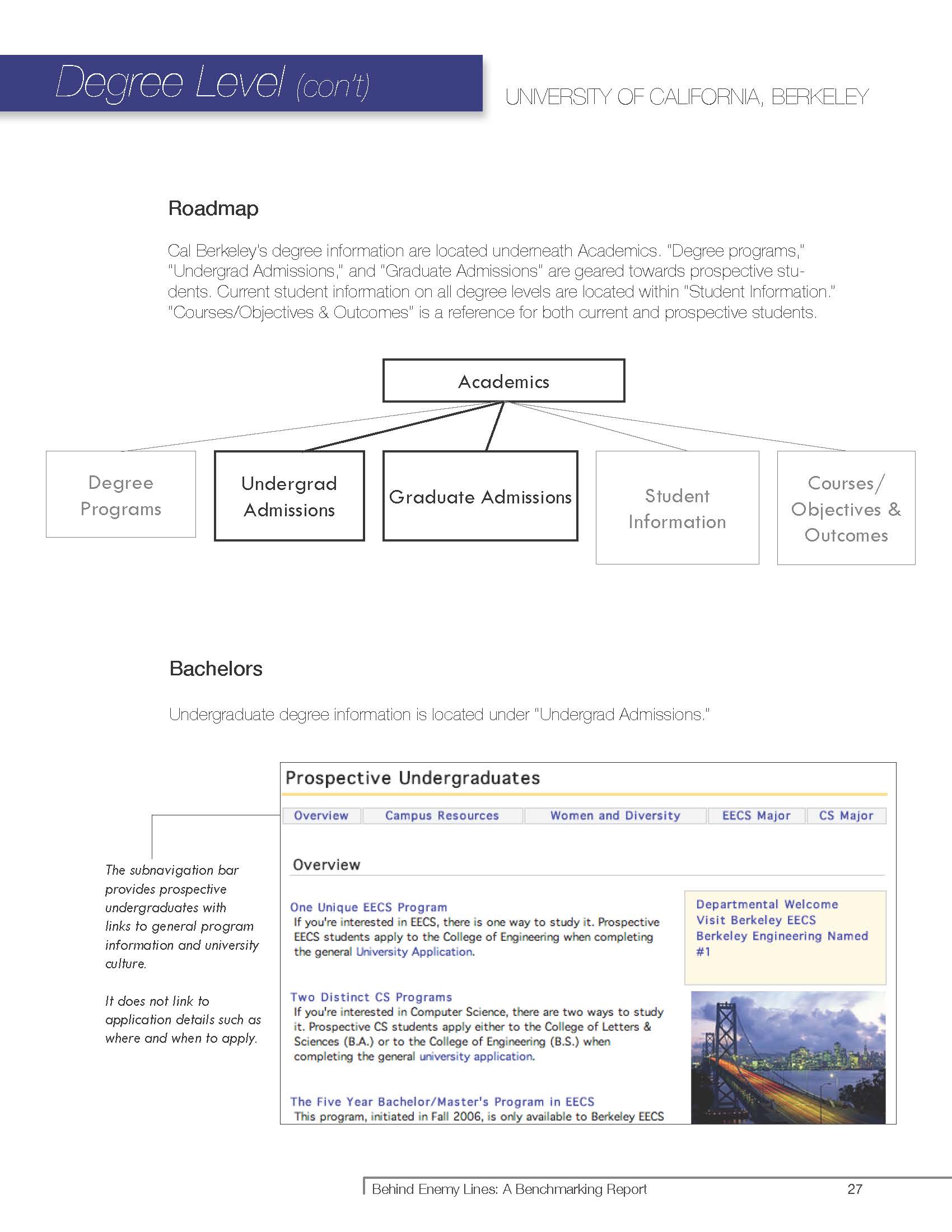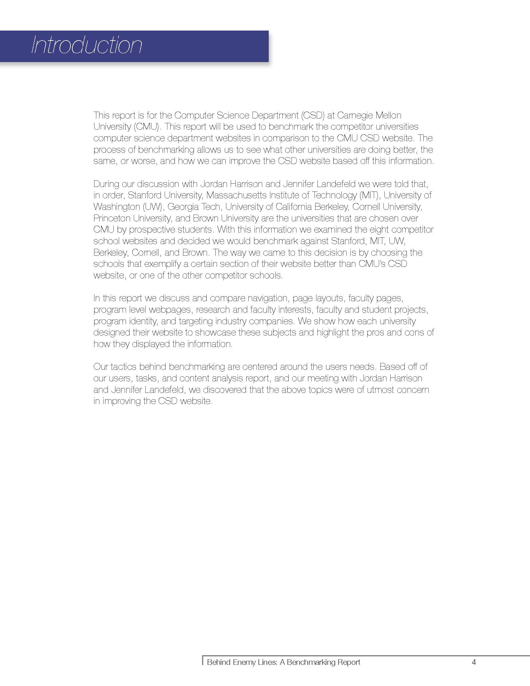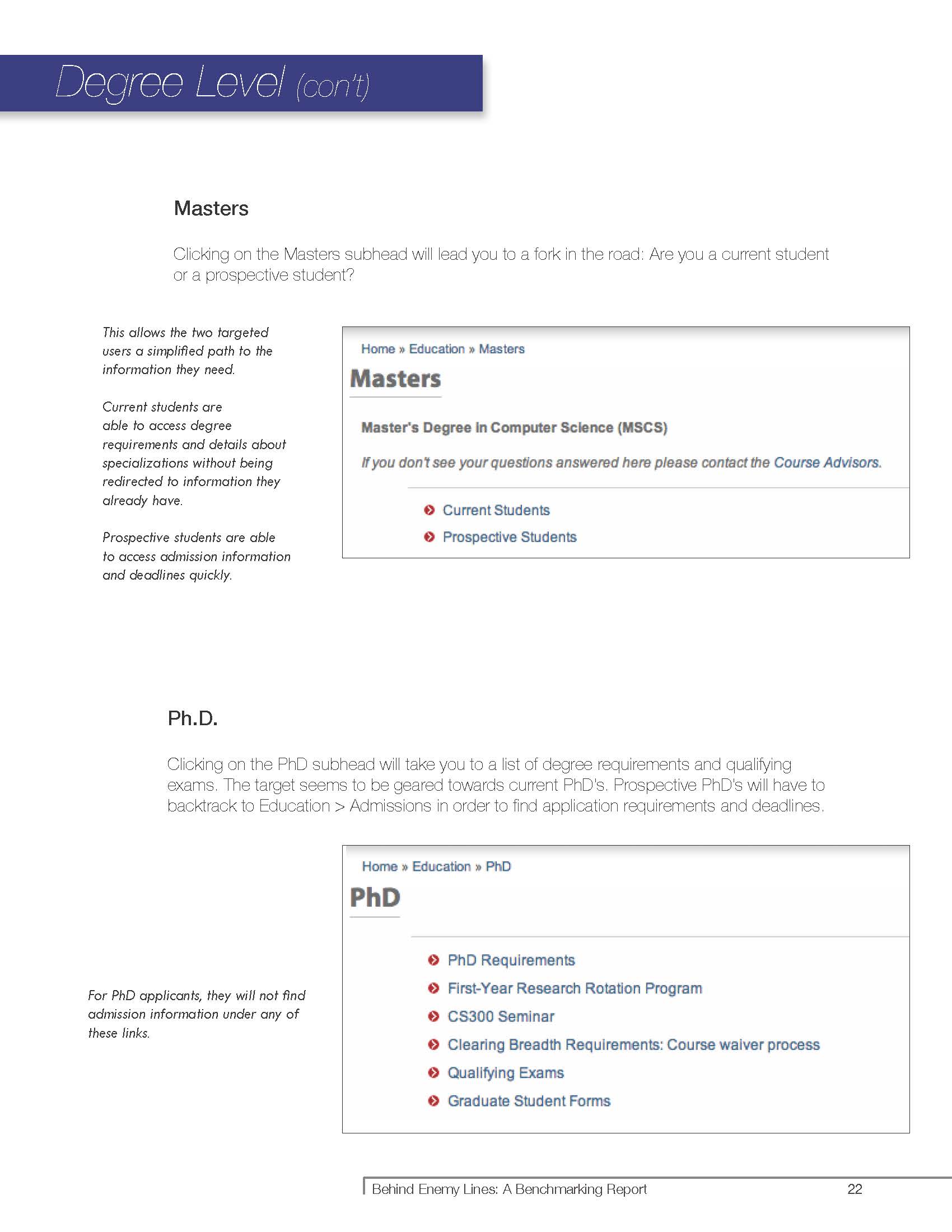 Conducted a competitive analysis of other computer science program websites. In the analysis, we reviewed the following benchmarks: navigation, page layouts, faculty pages, degree level pages, research and faculty interests, faculty and student projects, program identity, and targeting industry companies. Below is the benchmarking report summarizing our methodology and findings.